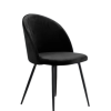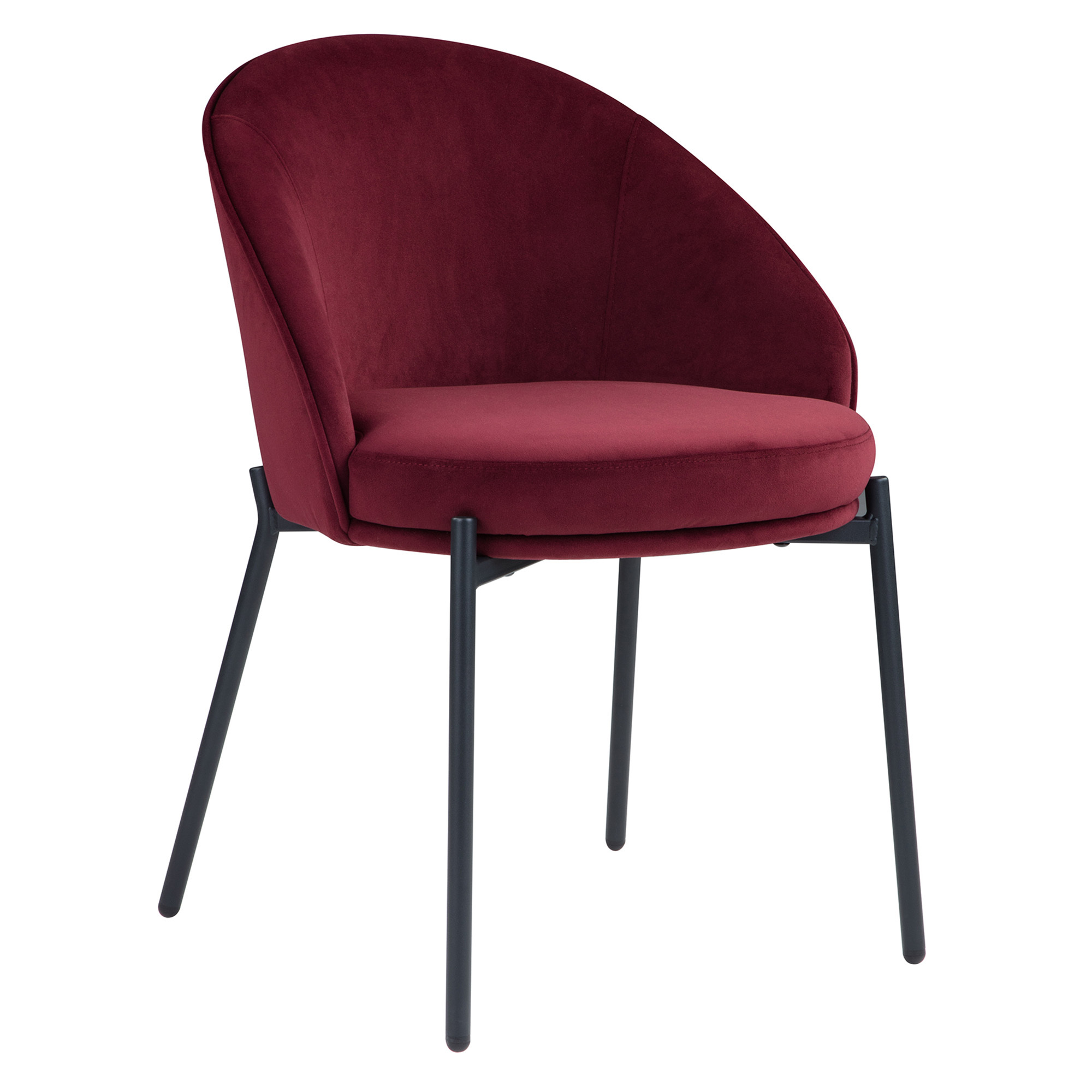 Burgundy velvet upholstered curved back & cushioned seat with black metal legs.